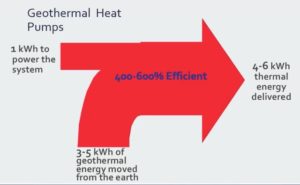 GHPs don’t produce electricity but are four times as powerful a renewable than solar PV or wind turbines.  They are leverage devices to avoid the consumption of electricity in heating or cooling.  One Kwh of solar PV or wind turbine energy can produce 2-to-3 units of thermal transfer in favorable air temperatures by an air-sourced heat pump.  One Kwh fed to a GHP can produce 4-to-6 units of thermal transfer under any weather condition, day or night, with or without sun or wind.  Storage is free and perpetual, underground, where it is isolated from weather above ground.