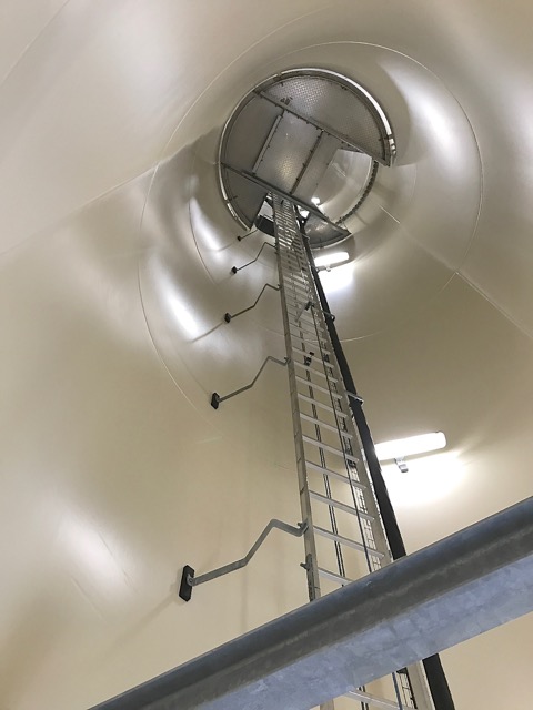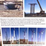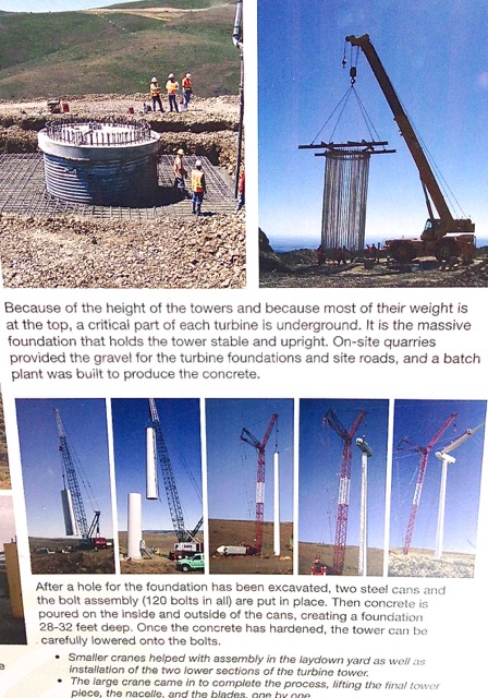 The turbines are Vestas v80 models (from Denmark). They are big, with a swept diameter of 262 feet. The rotor is composed of three adjustable pitch blades that can fully “feather” into zero wind resistance to stop rotation intentionally, including when windspeed exceeds 56 mph. The hub connects the rotor’s three blades with a schoolbus sized “nacelle,” housing a gearbox, generator, and a transformer which boosts voltage from 690v to 34,600v. That last 34.6kv rating is about three times the voltage of your neighborhood’s secondary transmission line. In accordance with Ohm’s Law, this higher voltage minimizes current loss while allowing far smaller conductors to carry this power (at less expense).