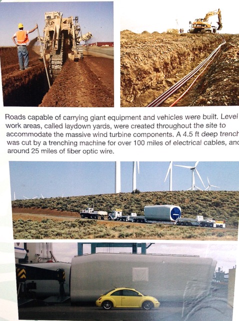 Wild Horse features an effective visitor center that tells its story seven months a year, and CaliforniaGeo visited in September of 2018. Below can be seen the wind and solar components that generate its electric power. One hundred and forty nine wind turbines are capable of a continuous 273 Megawatts (273 million watts) and 2,400 solar panels can produce 500 Kilowatts (500,000 watts).